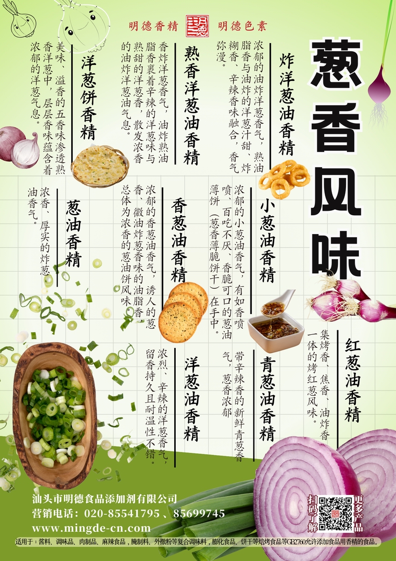 明德蔥香風味香精 | 油香蔥韻 覆蓋多場景 汕頭市明德食品添加劑有限公司推出的蔥香風味香精系列,涵蓋熟香洋蔥油香精、炸洋蔥油香精、小蔥油香精、香蔥油香精、洋蔥油香精、青蔥油香精、紅蔥油香精、洋蔥餅香精、蔥油香精等多種品類。產(chǎn)品呈現(xiàn)真實蔥香、洋蔥甜香與炸香特征,留香穩(wěn)定持久,適用于醬料、復合調(diào)味、肉制品、焙烤以及休閑食品等B端應用。